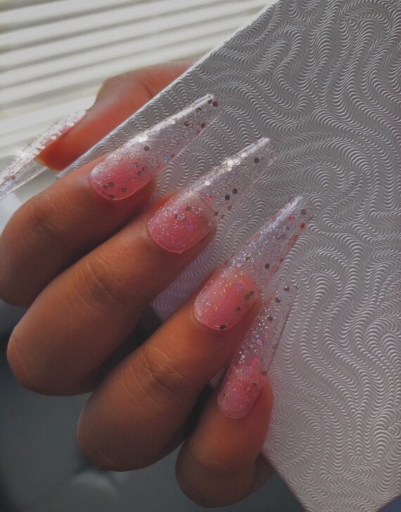 Pink Iridescent Press On Glitter Nails Faux Nails Clear Etsy